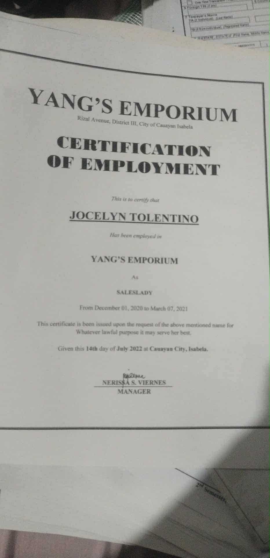 Certificate of Employment 2020 YANG'S EMPORIUM - Sales Lady Rizal Avenue, District III, City of Cauayan Isabela